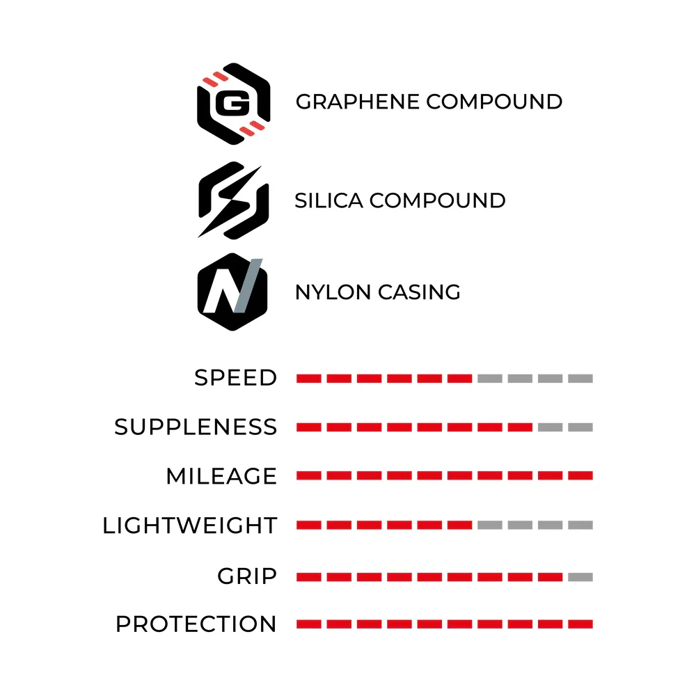 RideArmor features the proprietary ArmorSkin sidewall layer to ensure ultimate cut and abrasion protection. The reinforced, multi-layer, 100 TPI nylon casing is upgraded with a Kevlar® bead-to-bead anti-puncture protection layer and an inner shield to provide robustness and durability. The Graphene + Silica compound provides longer mileage, puncture resistance, high grip & speed in all conditions.